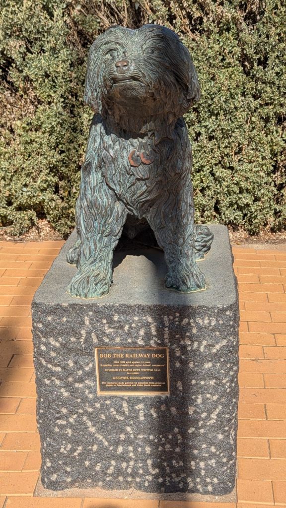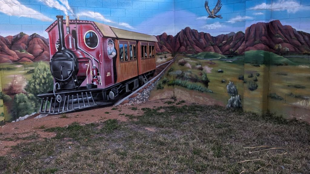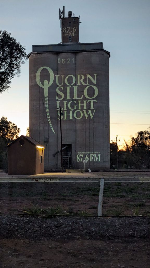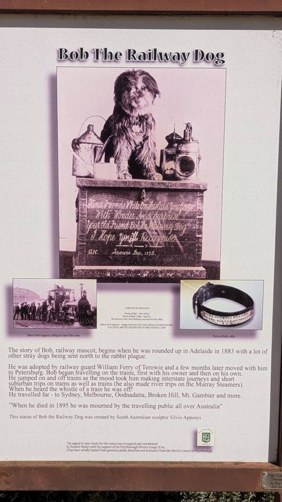 Jamestown is RM Williams birthplace. Learning from my disappointment over the donut situation in Ouyen i checked the opening hours of the Jamestown Bakery. Closed on Sundays. Backup plan engaged, donut procured from Clare bakery before departure😉Found a shortcut😁Railway Sidecar! Corners like its on Rails😁The manual version didnt look as much funObligatory steam train photo at Steamtown PeterboroughBob the railway dogAustralias biggest gum treeI had been banging on about the Goyder Line for days so nice to finally see a plaqueI have never taken the turnoff at the eastern end of Horrocks PassWell worth the 7kms dirt each way for the views across the Spencer GulfHorrocks CairnNew? Mural at Quorn takeawayGot here early this timeOld mate Goyder again