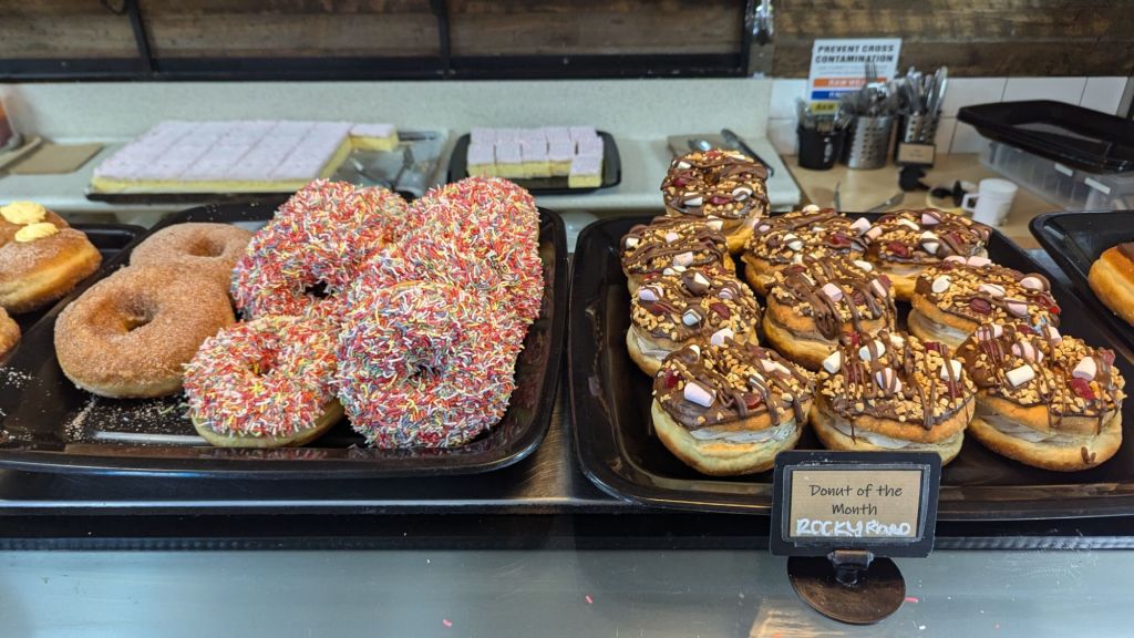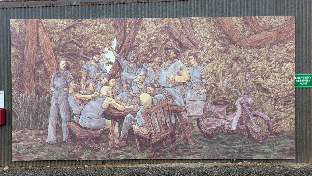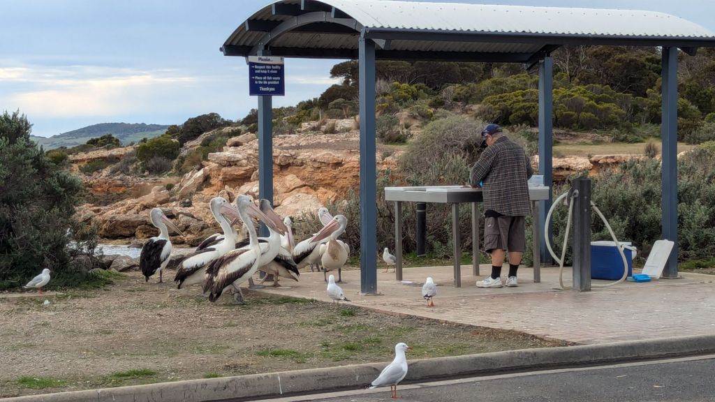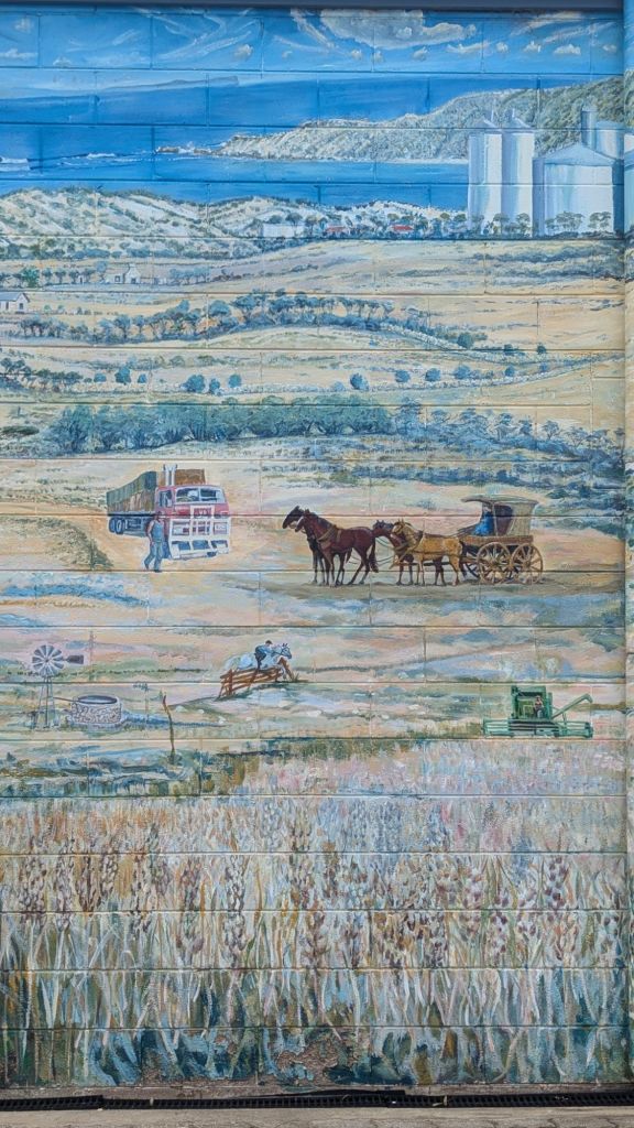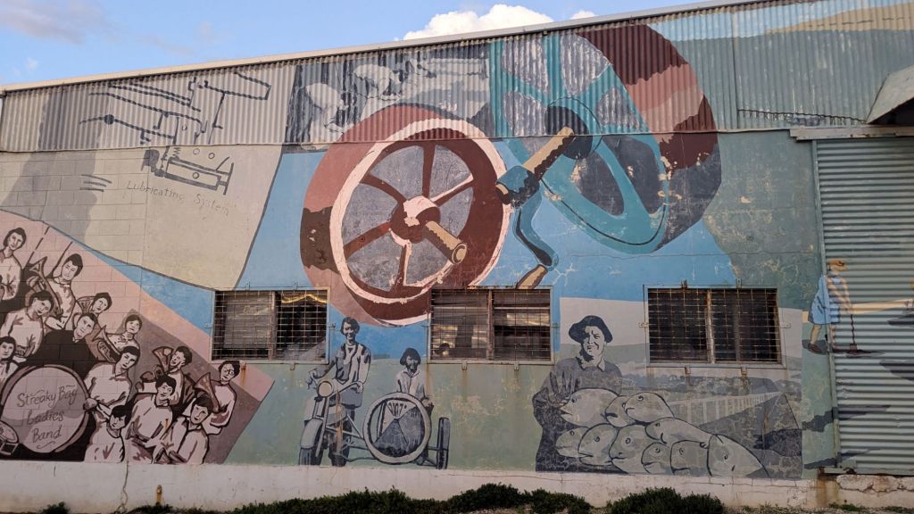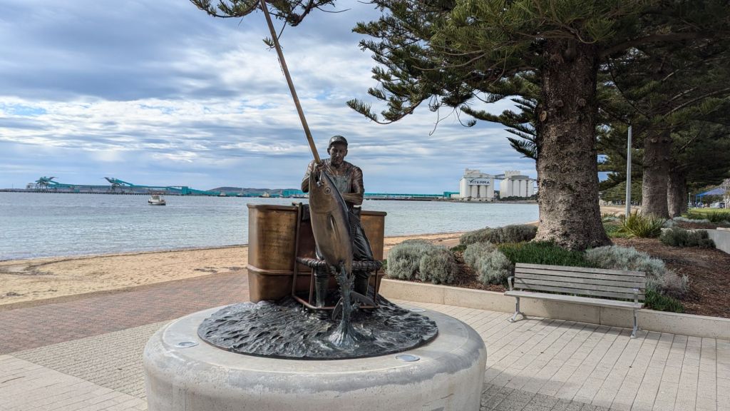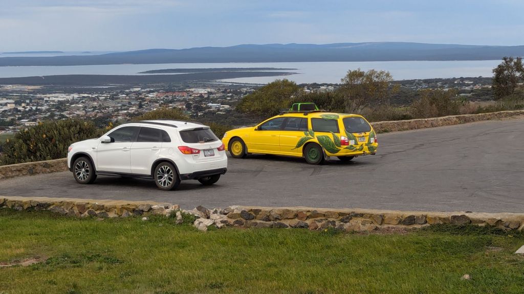 May have found the best Strawberry donut of the trip. Tumby Bay BakeryOne of many murals in Tumby Bay, this one looked new AND has a motorcycle in itAnother Black Stump. Note that this is a fireproof replacement for the OG one that burnt to nothing in a bushfire…Stopped at about 10 Historical Markers today, this made the faves cutSilos dominate the Winter Hill lookout at Port Lincoln. Binoculars reveal multiple nets which i can only assume were Tuna relatedAppreciated the effort this bloke put into colour coordinating not just the rear wheels, but also the tie downs on his ex Melbourne Taxi round Australia camper vanRoad-train country, Port Lincoln Grain Export TerminalSome well fed pelicans at Port Lincoln MarinaNice arid garden in Port LincolnPort Lincoln in one pic, Tuna fishing with the grain export terminal in the background. And yes. I know they fish for plenty of other seafood 😉Oysters and prawns for lunch in Coffin BayWaves a crashing at Locks WellCouple of fellas fishing off the beachPanoramic shot!Found a shortcut from Murphys Haystacks into Streaky BayMy favourite small section of the wraparound mural at EllistonGot into Streaky Bay in time for a sunset walk on the jettyAnd a mural with a sidecar to wrap the day up But then i saw this lLexus turn into the pub carpark, In chatting with the driver we found out that the SA Governor is touring the Eyre Peninsula.