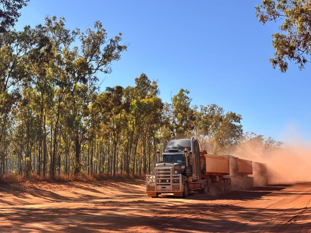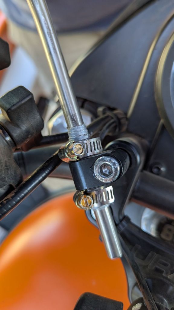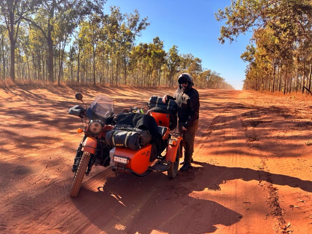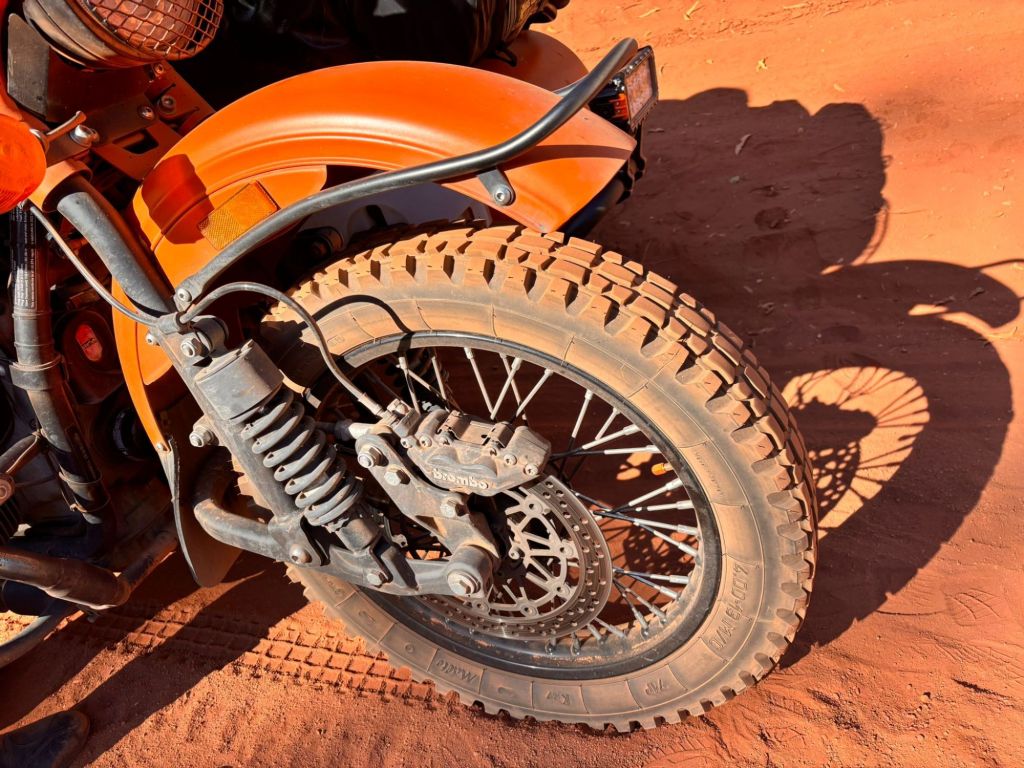 And 15 minutes down the road…A troublesome windscreen mount, not our first rodeo with this problem. Eventually it settles in its happy place until i can get the Locktite to take (Overnight). Not sure if the duct tape is to protect the screen or the headlight surround ..And an attempt to at least slow down the movement. Hose clamps for the win!One of a handful of road trains we saw during the dirt sections todayThe Ural paint scheme is called Outback Orange…