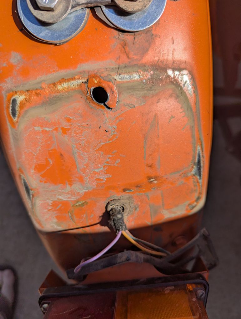Doing my daily checks I was mildly surprised how well the sidecar was holding up (well apart from the screen…). The right rear indicator bulb was loose, an easy fix. But then i got to this – a loose rear light assembly on the already troublesome, but holding up, sidecar mudguard.
