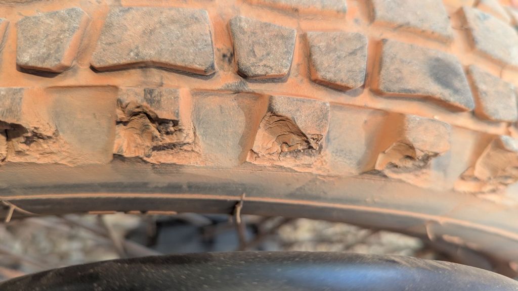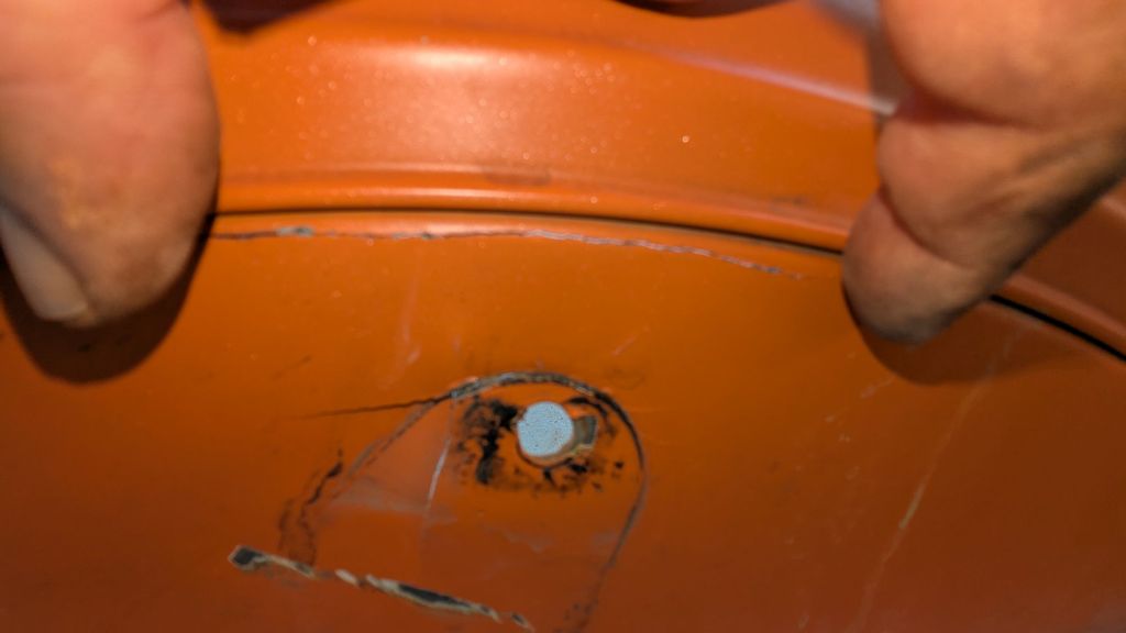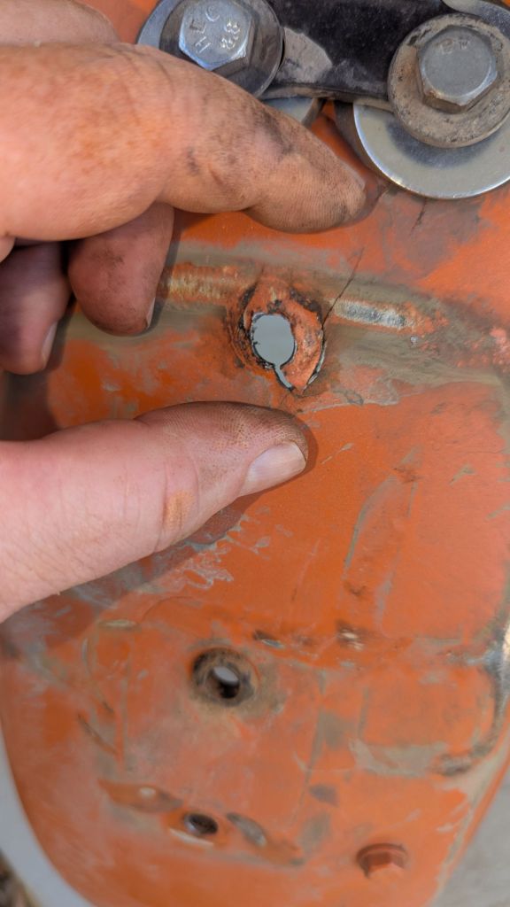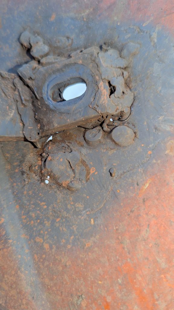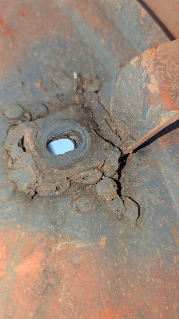 Centre tab and broken weldWhere the centre tab connects to mudguardAnother crack on the join, running between my fingersStress fracture under front light mountSection of bracket broken off and missing, between my fingersPrevious weld job, central bit only staying in place coz of build up of weld around it on both sides. Bracket broken above hole. This was the original issue discovered just before leaving Melbourne, and had clearly been broken for a while with the evidence of stress fractures around it Pre existing Stress fracturesStress cracking around the top mounting hole of the rear facing light assembly. Had added mudguard/panel washers to it a couple of days agoPrevious weld from bike sideInside close up of previous weldAnd broken bracketWhere the tyre had rubbed and caught on the nut of the broken mount. Got a but lucky here, much lower and we would be down a tyre/wheel change as well