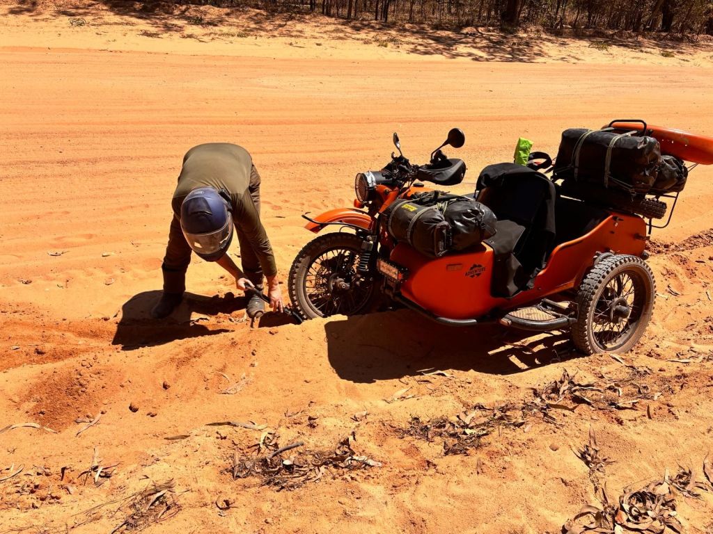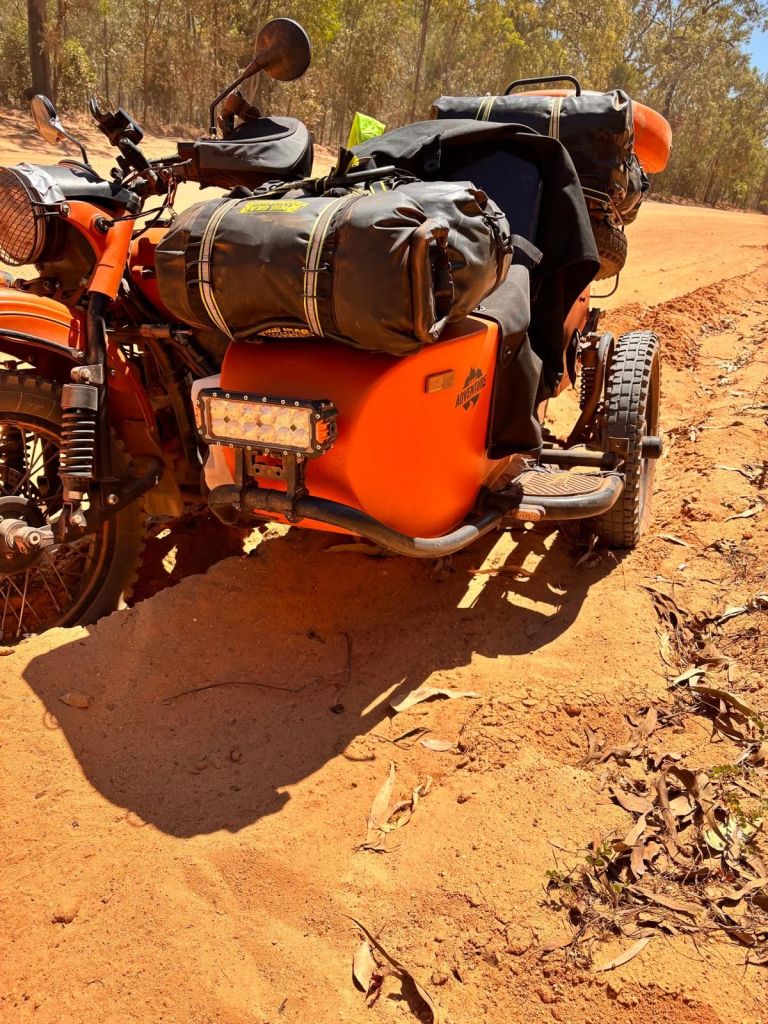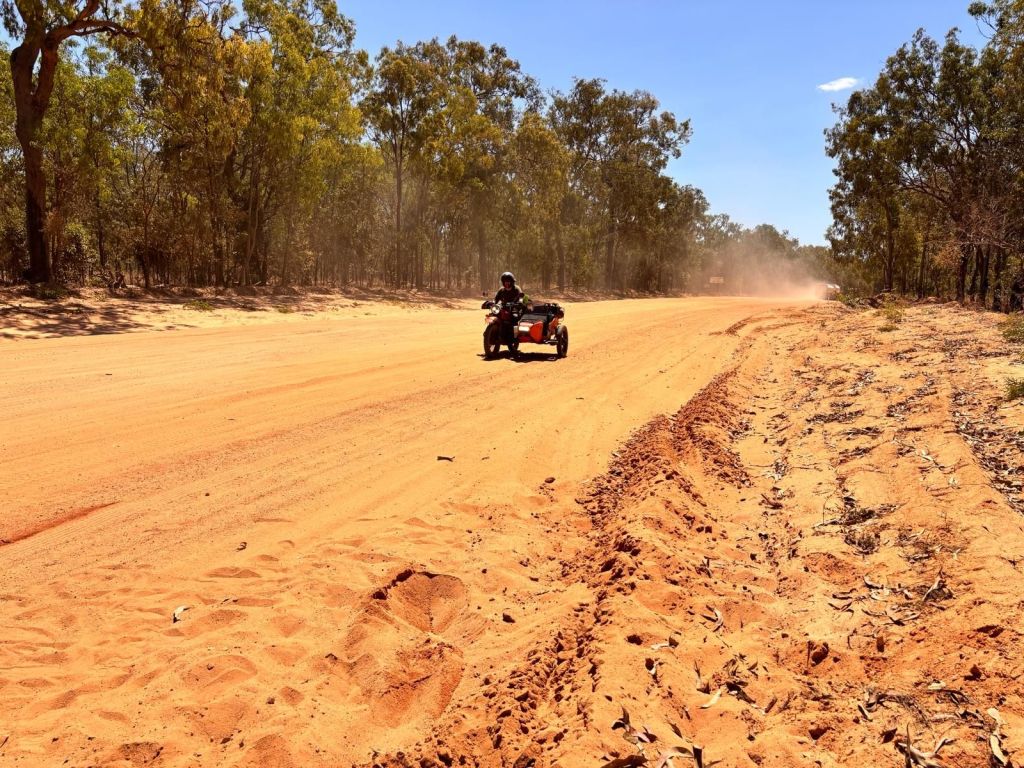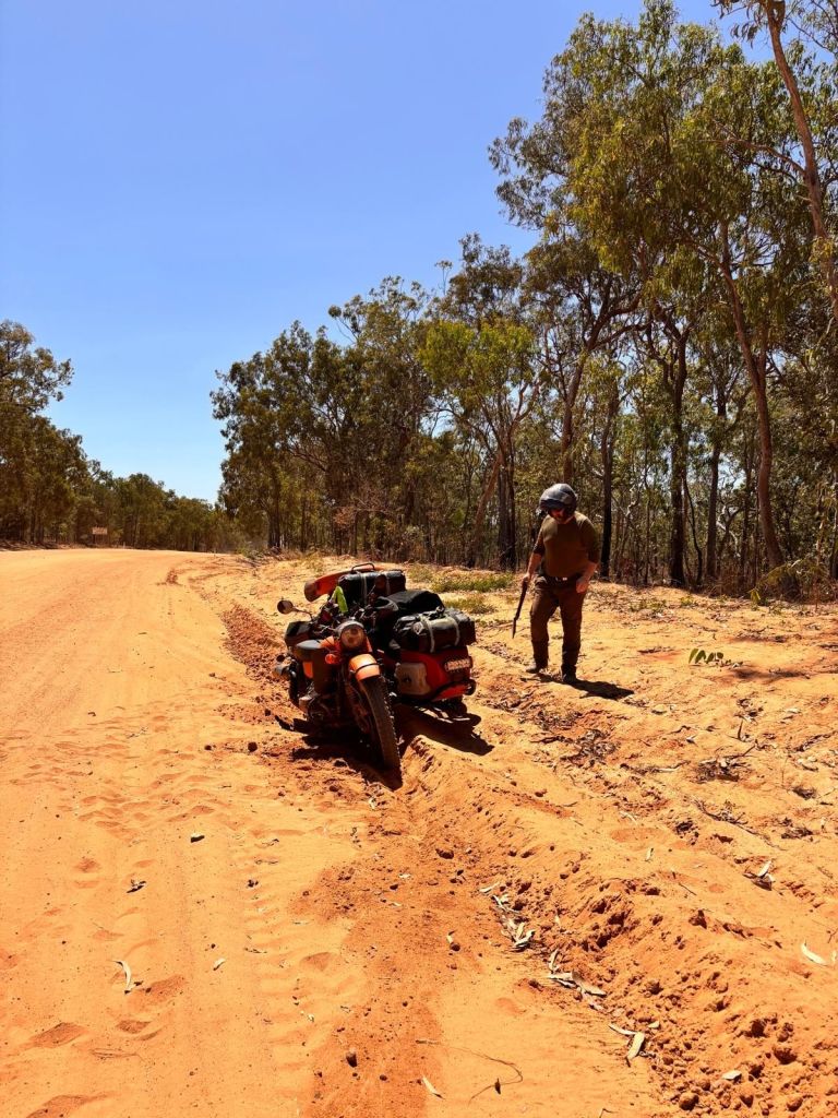 And then this happened. The sidecar wheel caught the soft sand and acted as a pivot, even when trying to power out of it. This would happen on other sections and you’d just go with it and spend some time in the drain before rejoining the road. But there was just more soft sand and no drain here…